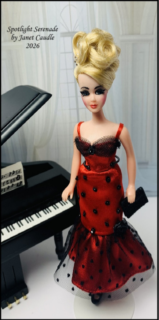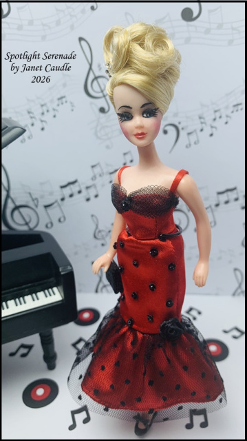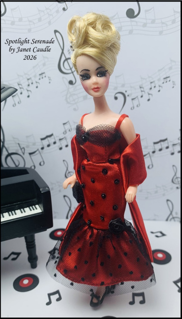 I first designed this gown in September 2023, inspired by "Rizzo's" dress from the dance scene in the movie Grease. That's where the music notes comes in! Instead of using my HHT Angie as I had intended, I couldn't resist using the Dawn doll that Mrs. Nick (Wendy) made for me. Additionally, I want to mention that the black bow heels (not included) were crafted by Jeannette Smith (email) jdqb@zoominternet.net
